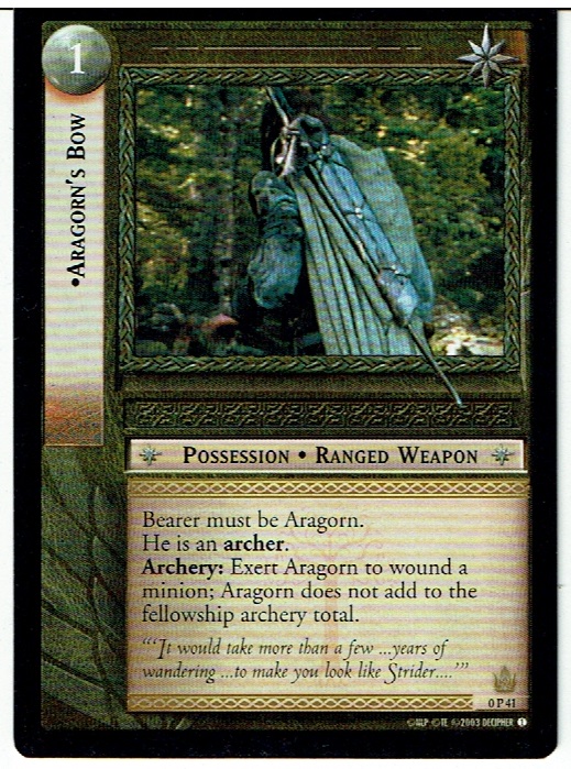 Promotional card 0p41 Aragorn’s Bow from the Lord of the Rings Trading card game produced by Decipher.