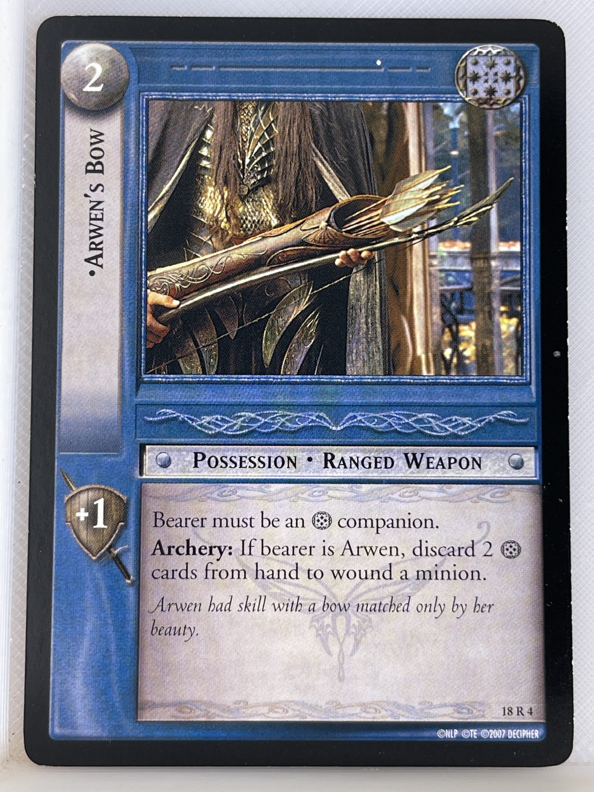 Rare card 18R4 Arwen’s Bow from the Treachery and Deceit expansion of the Lord of the Rings Trading card game produced by Decipher.